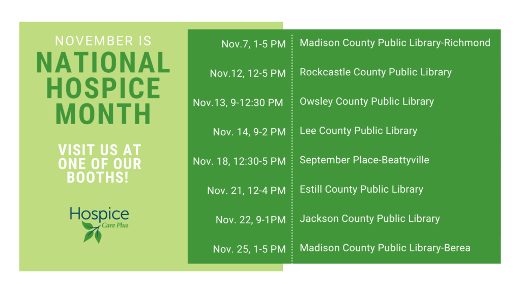 In honor of National Hospice Booth, Hospice Care Plus is hosting multiple information booths in Estill, Jackson, Lee, Madison, Owsley, and Rockcastle counties.