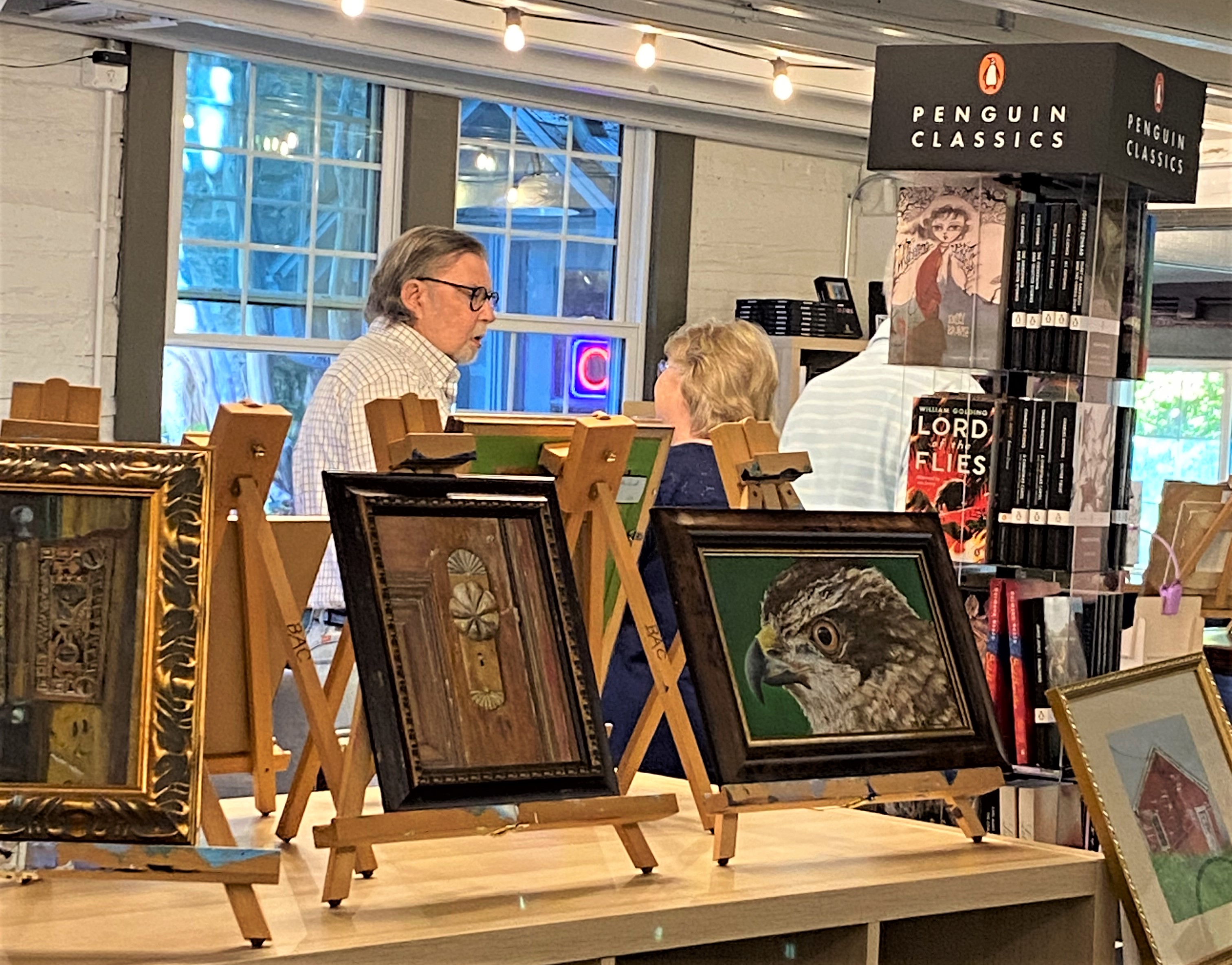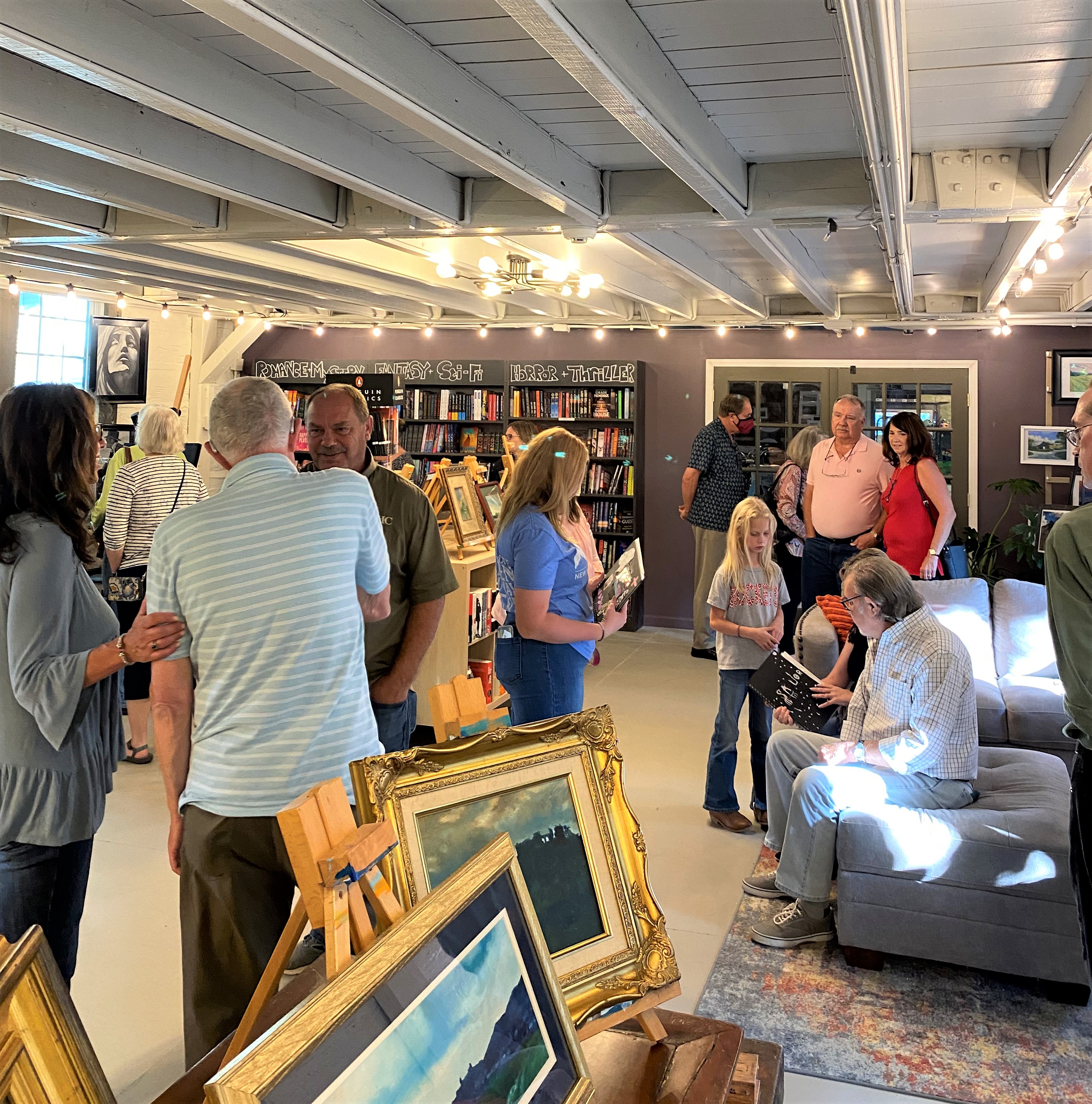Finding a venue that was available at the right time took a while, but a perfect and beautiful location was found. The Taleless Dog Booksellers in Berea volunteered their time and space on a lovely fall evening. The inside of the bookstore provided a spacious, brightly lit location to display Robert’s paintings, and the courtyard outside was perfect for tables of tasty finger foods brought by staff and volunteers for patrons of the show.