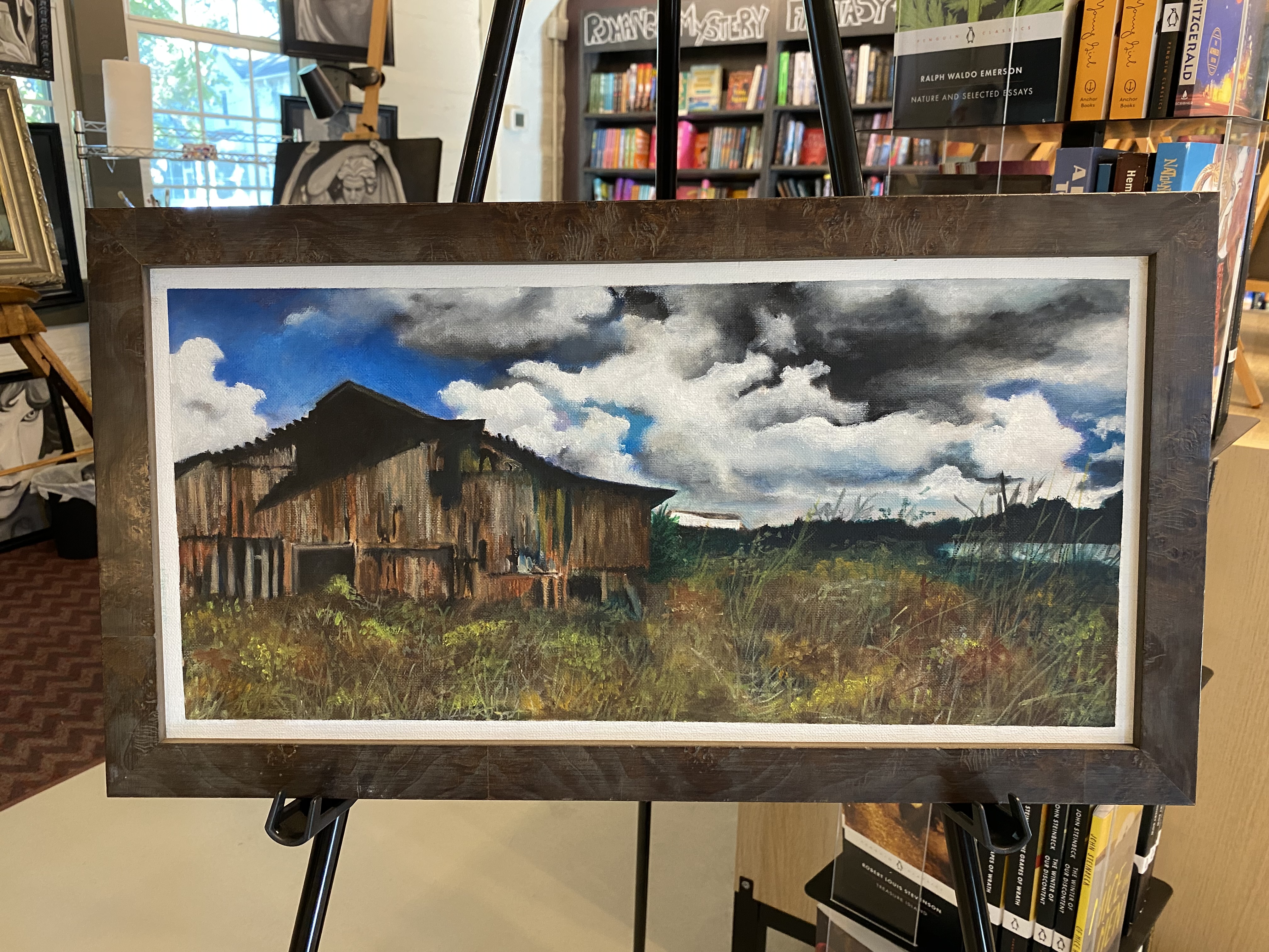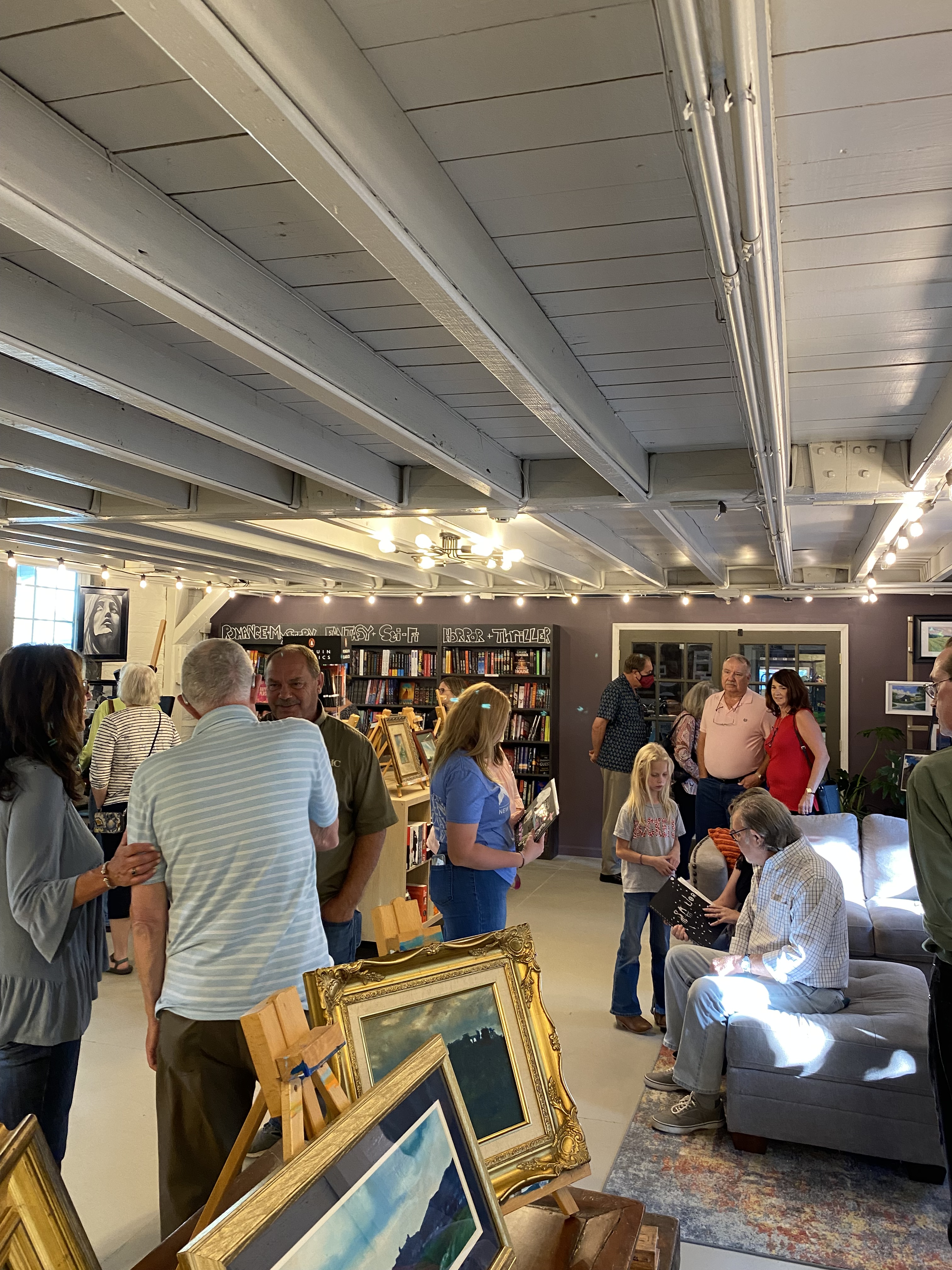 Finding a venue that was available at the right time took a while, but a perfect and beautiful location was found. The Taleless Dog Booksellers in Berea volunteered their time and space on a lovely fall evening. The inside of the bookstore provided a spacious, brightly lit location to display Robert’s paintings, and the courtyard outside was perfect for tables of tasty finger foods brought by staff and volunteers for patrons of the show.