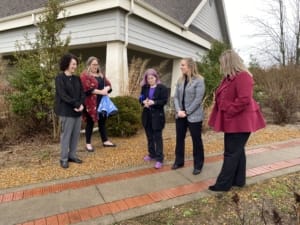 Jamie views Dee and Frank’s memorial brick on the Center’s memorial walkway. Left to right: Lisa Cox, Hospice Care Plus CEO; Stefanie Manes, Development Coordinator; Jamie Hull; Amber Middleton, Edward Jones Financial Advisor; and Paula Billups, Edward Jones Branch Office Administrator.