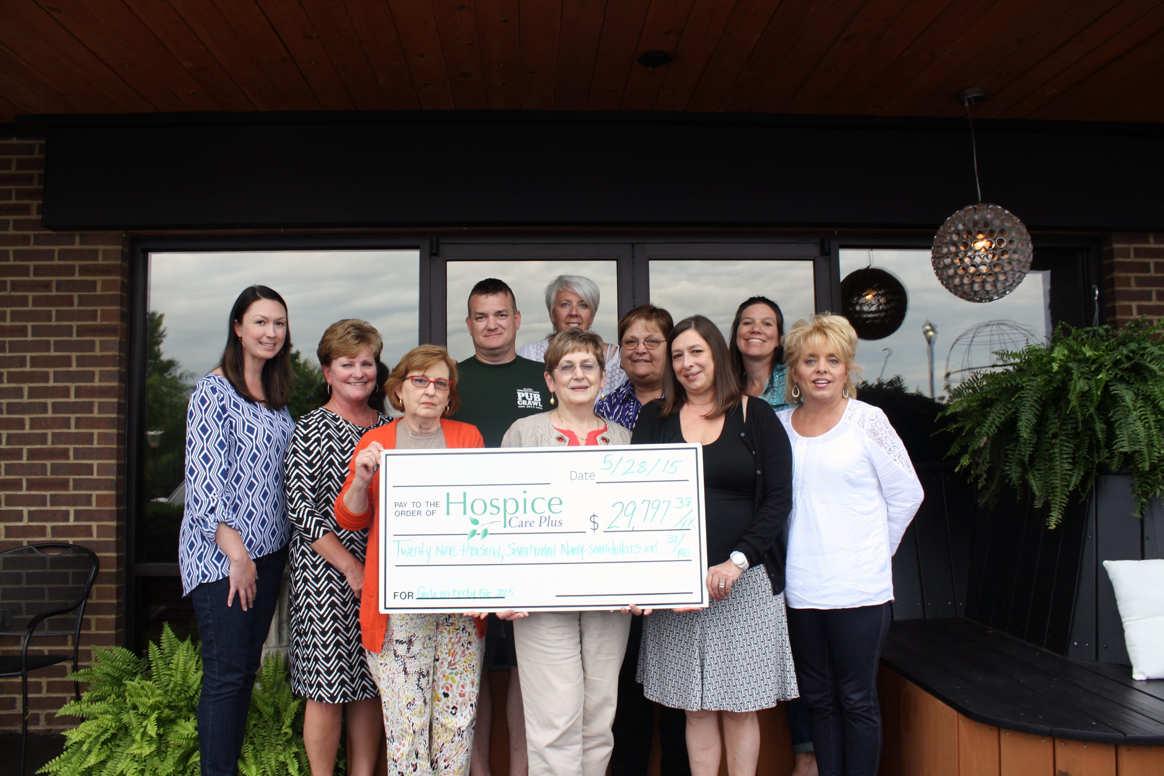 The Gala on Derby Eve Committee presents Hospice Care Plus with a check for $29,797.38, the total raised at the event this year. From left: Amy Reister, Donna Haney, Margaret Cornelison, Nora Ruth Jenkins, Catharine Walczyk and Shelley Ward. Back row: Bill and Julie Hatfield, Linda Fritz, and Nikki Stuart.
