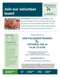 Hospice Care Plus is hosting a training for new volunteers on Sat., Feb. 25, from 9 a.m. to 4 p.m. at our Compassionate Care Center in Richmond.